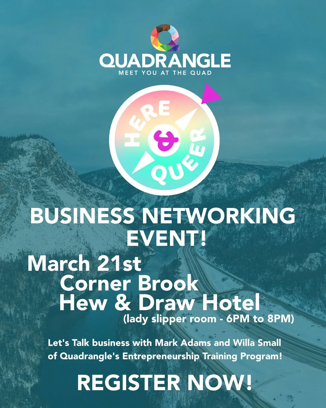 Quadrangle would love to meet you! Come join Mark Adams and Willa Small of Quad’s Entrepreneurship Training Program for an informal networking session. March 21st at 6PM in Hew and Draw’s Lady Slipper Room.