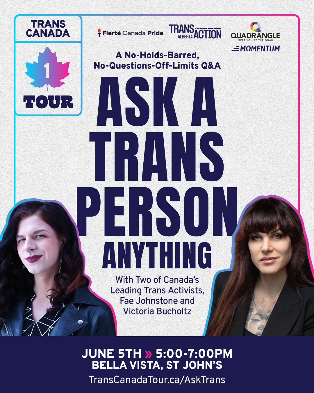 This event is brought to you by Society of Queer Momentum, Fierté Canada Pride, Trans Action Alberta and Quadrangle NL