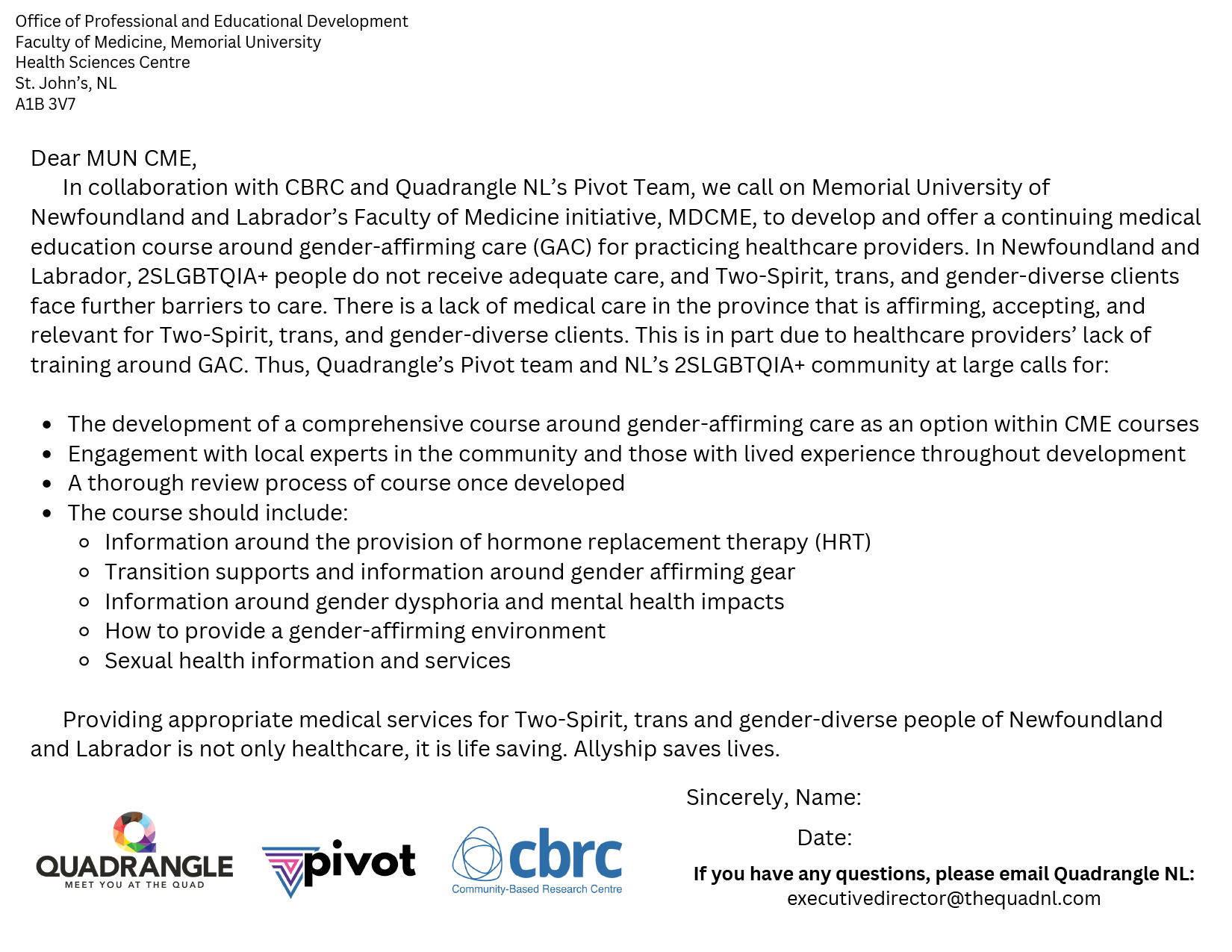 In Newfoundland and Labrador, 2SLGBTQIA+ people do not receive adequate care, and Two-Spirit, trans, and gender-diverse clients face further barriers to care. There is a lack of medical care in the province that is affirming, accepting, and relevant for Two-Spirit, trans, and gender-diverse clients. This is in part due to healthcare providers’ lack of training around GAC. Quadrangle NL’s Pivot participants are asking MUN Med Continuing Medical Education (CME) initiative to hear the needs of our community. Thus, our calls to action are: