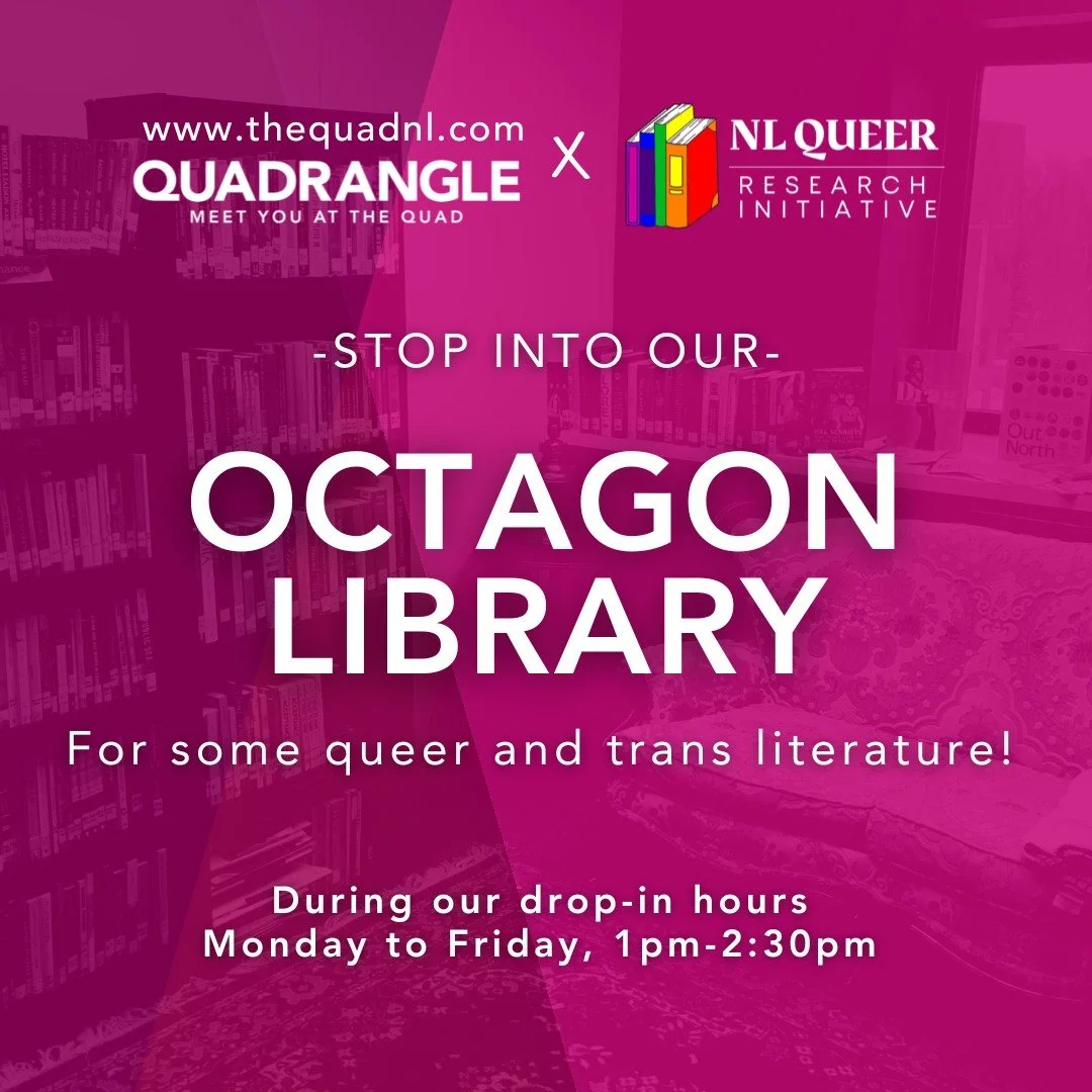 The Octagon Library is open when Quadrangle is open (visit https://www.thequadnl.com/ for the its hours). Quadrangle is located at 16 Forest Road, 3rd Floor, in St. John’s.